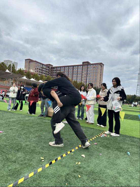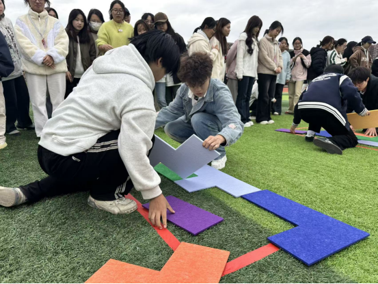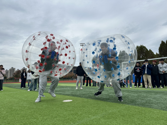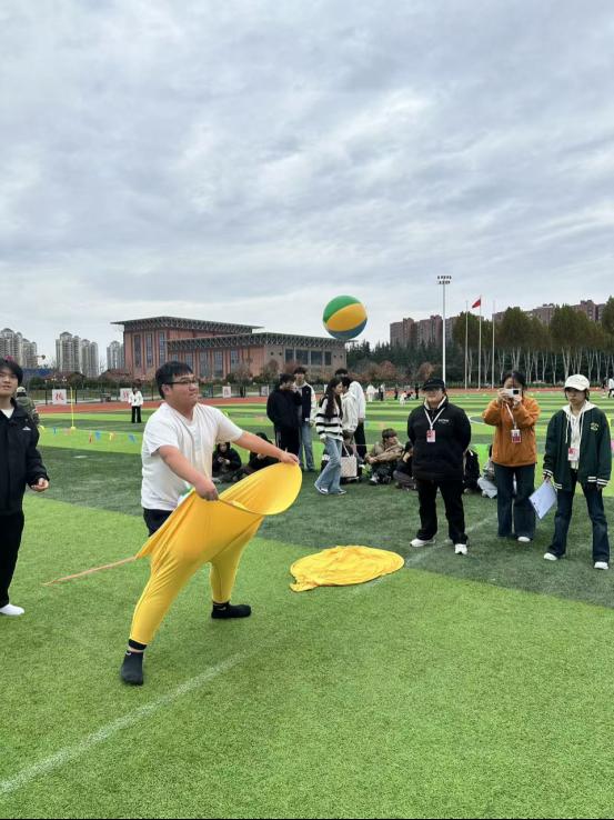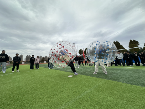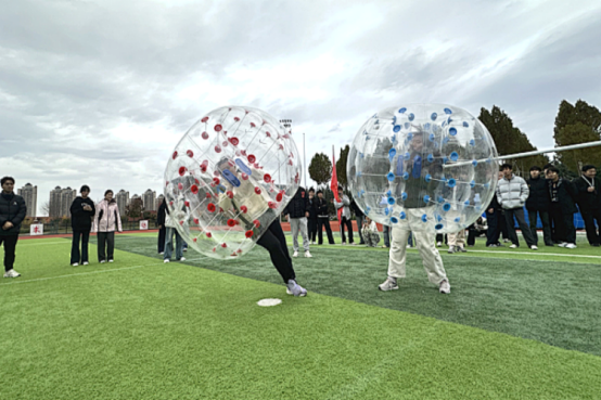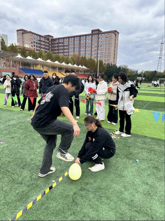本次运动会设置了8个兼具趣味性与协作性的比赛项目,涵盖相扑比赛、欢乐踩气球、俄罗斯立体方块、石头剪刀布接力、公鸡下蛋、滚雪球、游戏裤子趣味投球、神龙摆尾等。赛场上,选手们奋勇争先、协作无间,踩气球的欢声笑语、滚雪球的默契接力、投球项目的精准配合,让田径场成为充满活力的青春舞台,加油声与欢呼声此起彼伏。